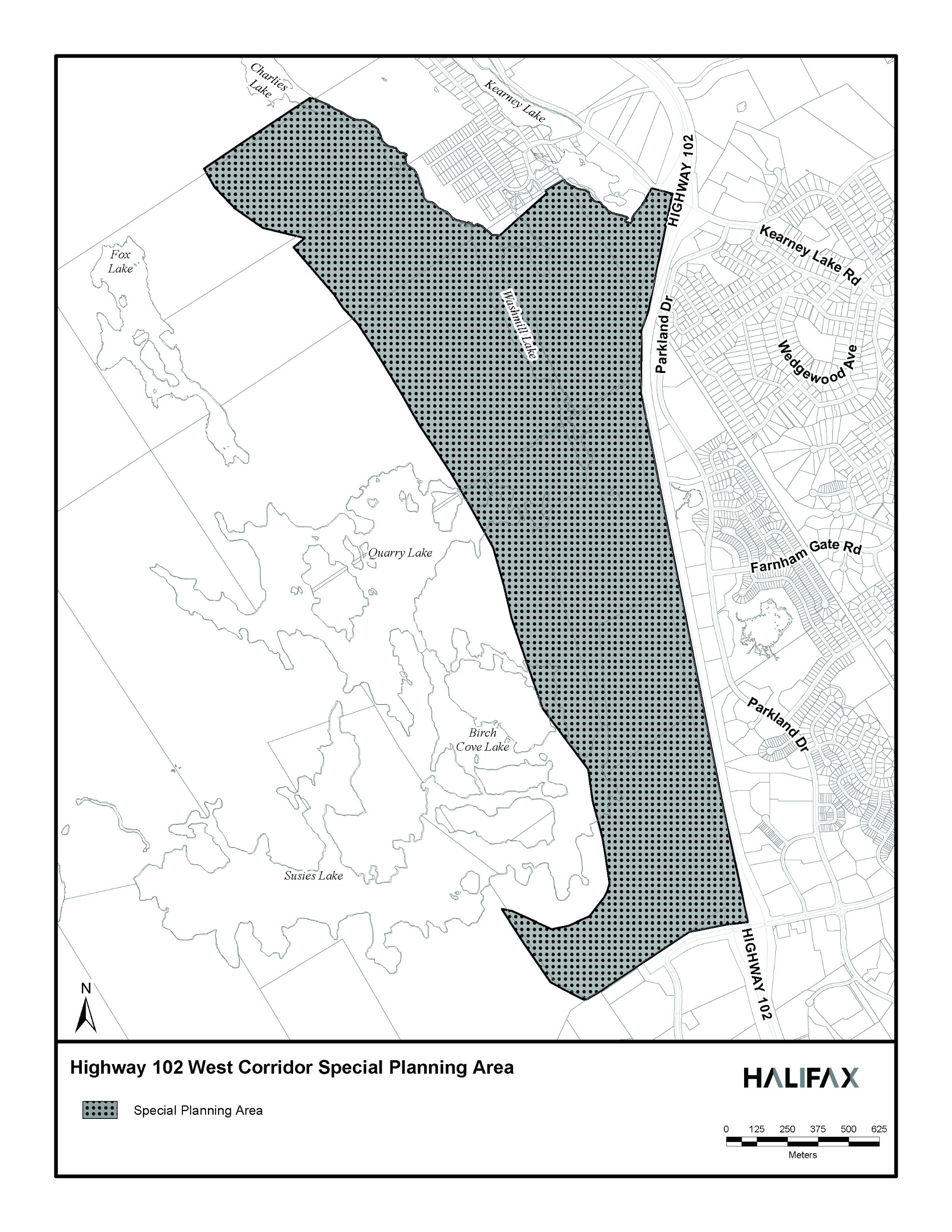 The Highway 102 West Corridor Special Planning Area is approximately 255 hectares (630 acres) of land located west of Highway 102 between Kearney Lake Road and Lacewood Drive in Halifax. The 2006 Regional Municipal Planning Strategy designated these lands as “Urban Settlement” (US) - a potential growth area where sewer and water services may be extended to allow the development of a new community within the plan’s intended timeframe.